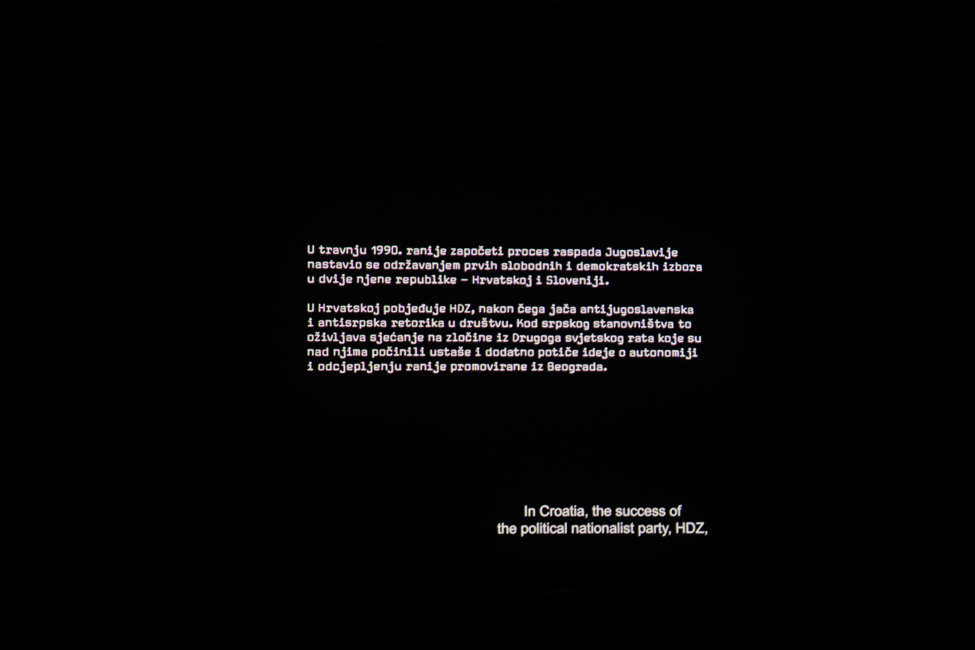 – Već sadržaj kratkog teksta na početku filma, koji ignorira pravi uzrok rata, pokazuje smjer narativa filma koji su scenaristi osmislili i njemu selektivno podredili govornike u filmu: »U travnju 1990. ranije započeti proces raspada Jugoslavije nastavio se održavanjem prvih slobodnih i demokratskih izbora u dvije njene republike – Hrvatskoj i Sloveniji. U Hrvatskoj pobjeđuje HDZ, nakon čega jača antijugoslavenska i antisrpska retorika u društvu. Kod srpskog stanovništva to oživljava sjećanje na zločine iz Drugog svjetskog rata koje su nad njima počinili ustaše i dodatno potiče ideje o autonomiji i odcjepljenju ranije promovirane iz Beograda. U kolovozu dio Srba započinje oružanu pobunu protiv vlasti u Zagrebu prekidajući prometne veze između sjevera i juga zemlje. Na istoku koji graniči sa Srbijom još vlada mir.«