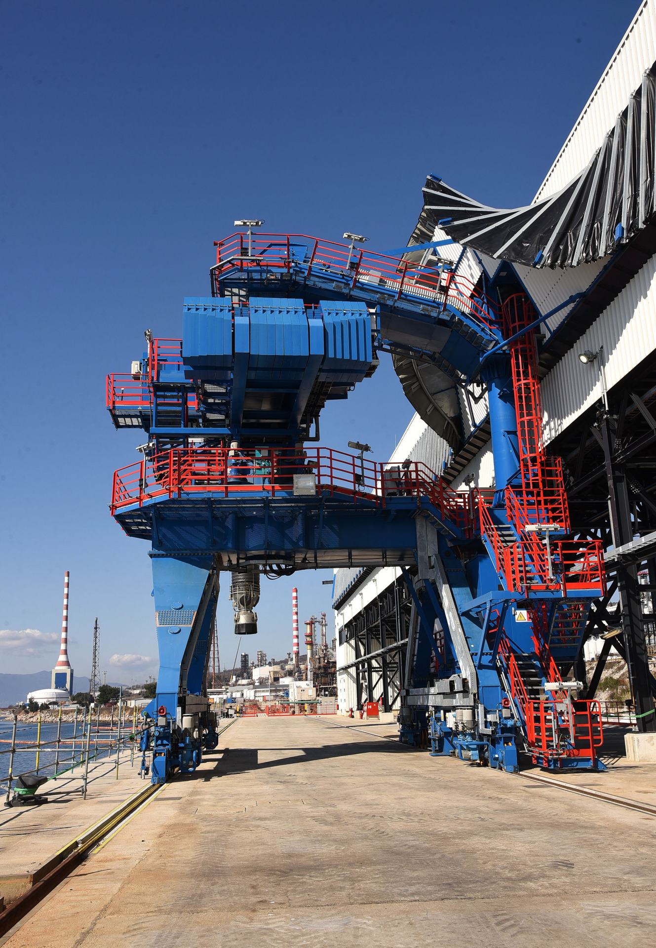 Glavni dio DCU-a, kako su nam objasnili domaćini, čine procesna peć i koksne komore te veliko odlagalište za petrol-koks, smješteno ispod samog postrojenja. Iz njega se petrol-koks transportira potpuno zatvorenom trakom do silosa za skladišenje, kapaciteta dvadeset tisuća tona, a iz silosa se, opet zatvorenom transportnom trakom, prebacuje do novoizgrađenog lučkog pristaništa gdje će se prekrcavati na brodove.