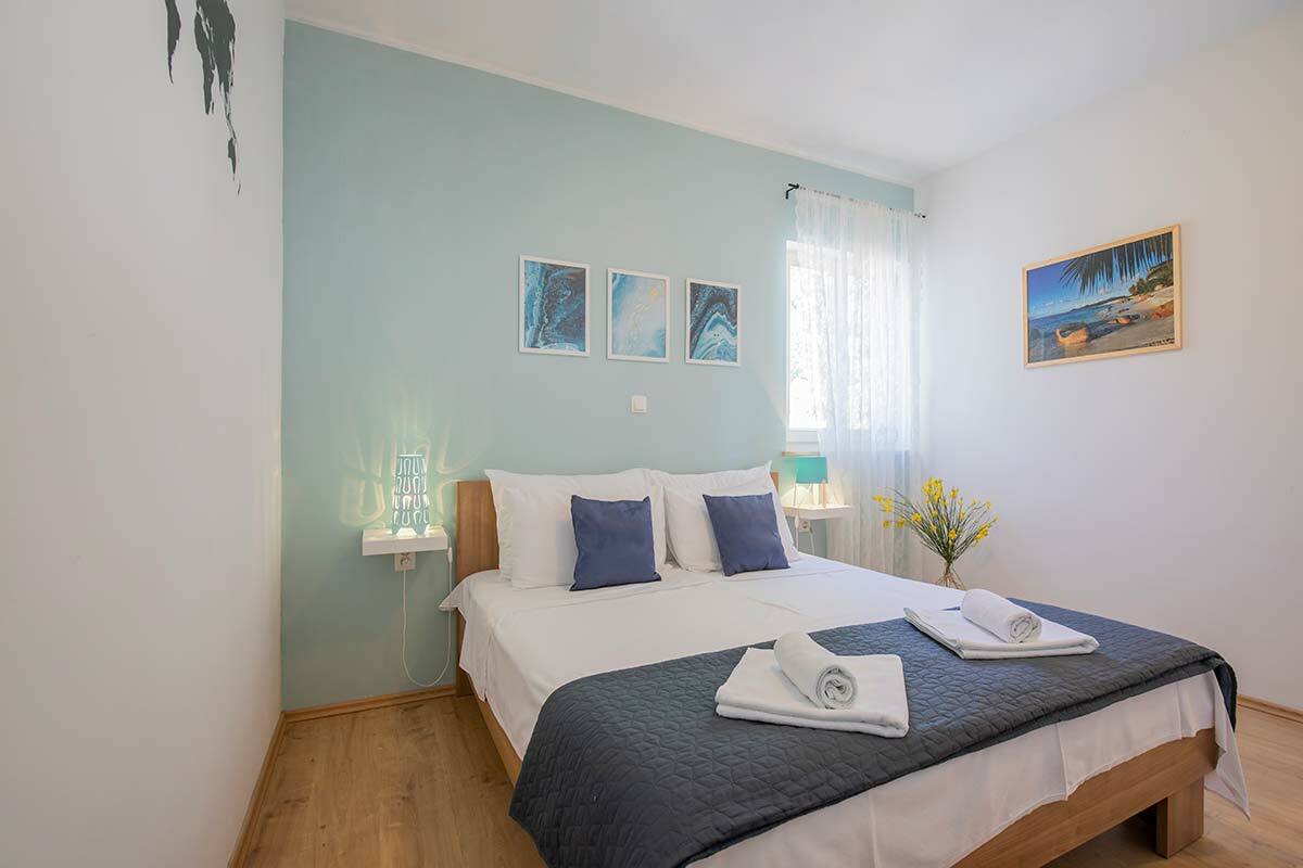 U elegantnom apartmanu konfiguracije 2+2 ležaja, uređenom u privlačnom primorskom stilu, s velikom terasom i okućnicom, kao i prostranim, čuvanim parkiralištem, oduševljava i zvučna izolacija. Tako gosti dobivaju apsolutni mir i mogućnost potpunog odmora. Mogu biti i nešto bučniji, a da nikom ne smetaju.