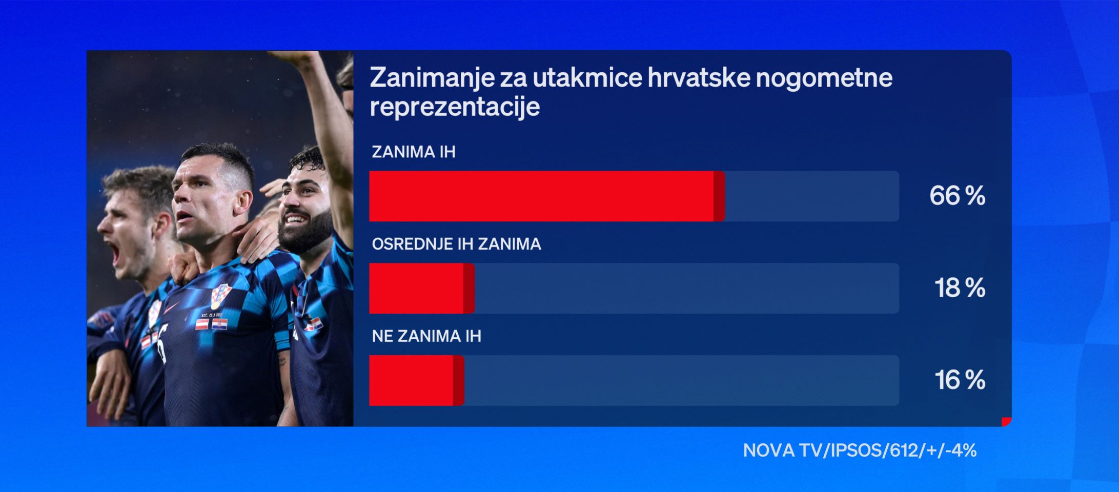 Navijačke rekvizite tako je već pripremilo 66 posto ispitanika, koliko ih se izjasnilo da ih utakmice Vatrenih zanimaju,18 posto je možemo kolokvijalno reći “li-la”, a utakmice u kockastim dresovima ne zanimaju 16 posto njih.