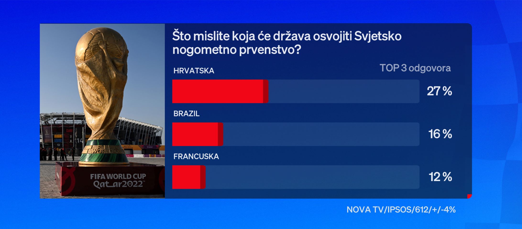 Ispitanici su uvjereni da će Hrvatska osvojiti svjetsko prvenstvo, njih 27 posto. Glavni konkurenti našima su Brazil i Francuska.
