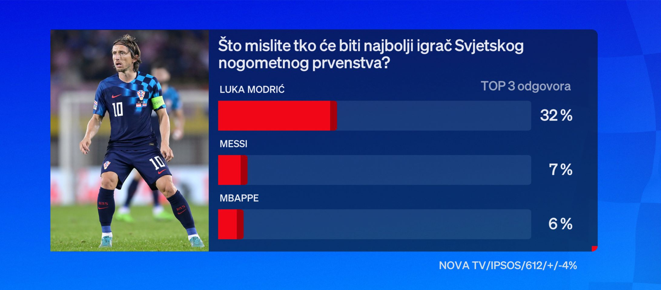 Optimizma ne manjka ni kada su u pitanju igrači – na pitanje tko će biti najbolji igrač prvenstva, odgovor je – Luka Modrić za 32 posto ispitanika.