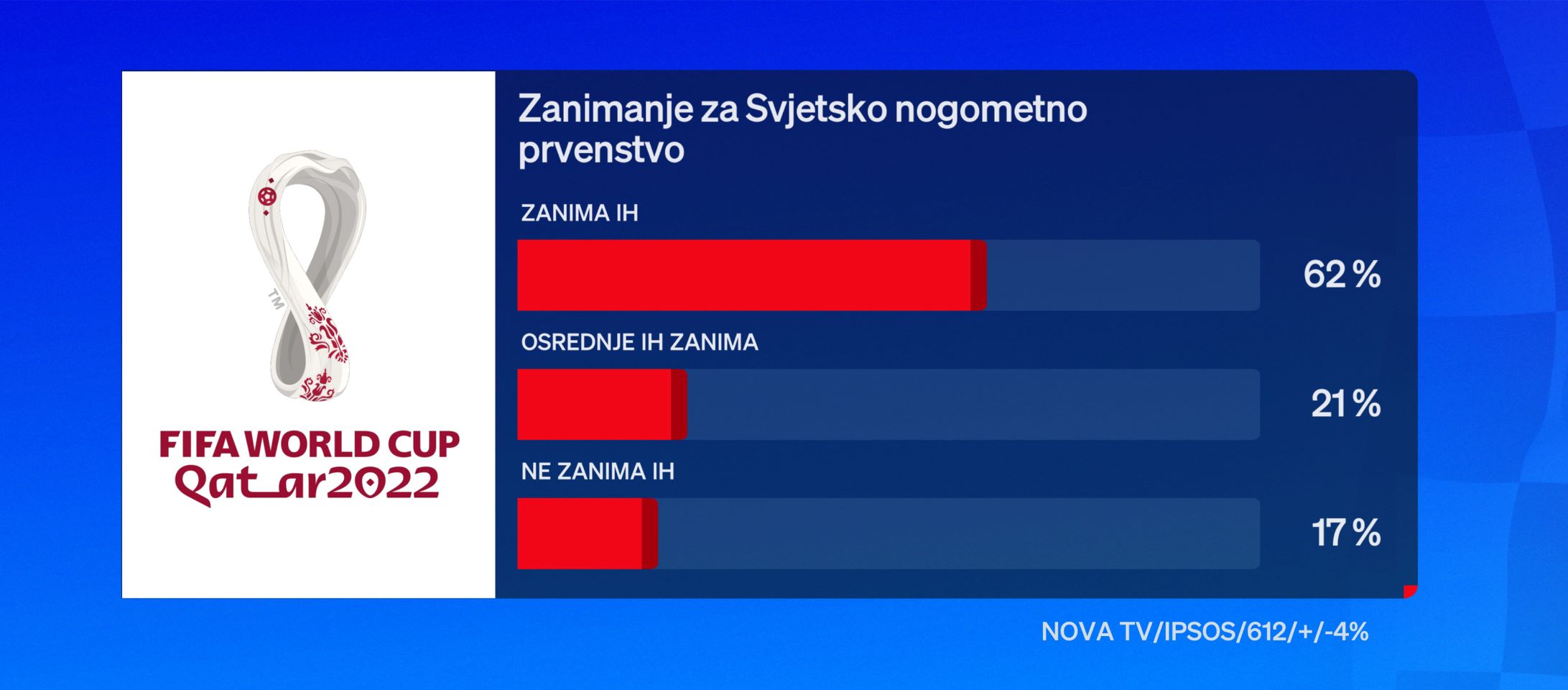 Puno se raspravljalo o ovogodišnjoj lokaciji Svjetskog nogometnog prvenstva. Što se tiče te odluke 30 posto ispitanika kaže da podržava odluku FIFE o održavanju prvenstva na Bliskom istoku. Čak 65 posto ne podržava takvu odluku, a njih pet posto u ovom trenutku nema mišljenje o tome.