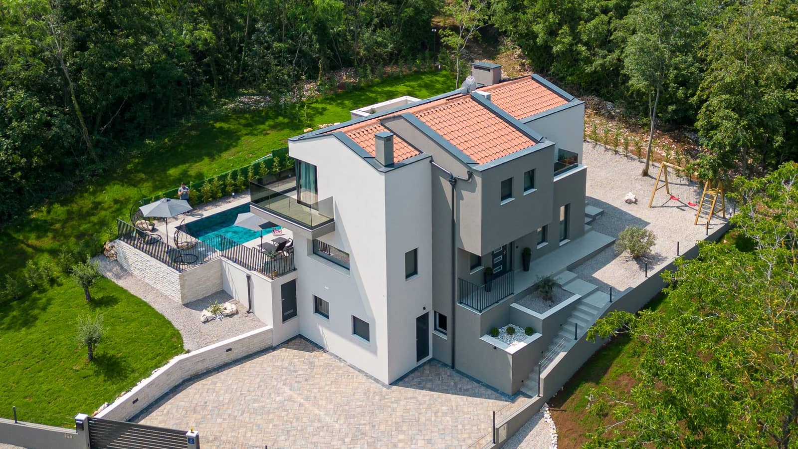 Kuća je odlično osmišljena, svi su sadržaji na prvom katu povezani. Veliki »open space« dnevni boravak s modernom kuhinjom, što više s kuhinjskim »otokom« koji prema Dajaninoj zamisli ima i jedan zanimljivi umetak uklopljen u »stakleni okvir« što mu daje zanimljivu dinamiku, da bi se na sve to nadovezao također jako veliki i bogato opremljeni prostor koji je povezan s bazenom. Iz dnevnog boravka se elegantnim stepenicama ulazi u sobe, a i ravni krov je dobio funkciju – jacuzzi i još jedna panoramska terasa jako dobro zaokružuju čitavu priču.