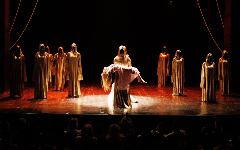 Dodatno, likovi u zlatnim dugim haljinama, prekrivenih lica, sjajan su prikaz unutarnje borbe ili, recimo to tako, unutarnjih demona. Multimedijalnošću, videozapisima prikazane su epizode, a izvedbom glavne glumice ono što slijedi nakon tog transa; tuga, strah, sram.