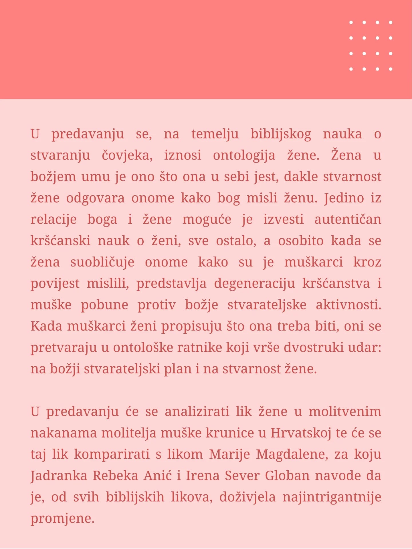 U predavanju se, na temelju biblijskoga nauka o stvaranju čovjeka, iznosi ontologija žene.