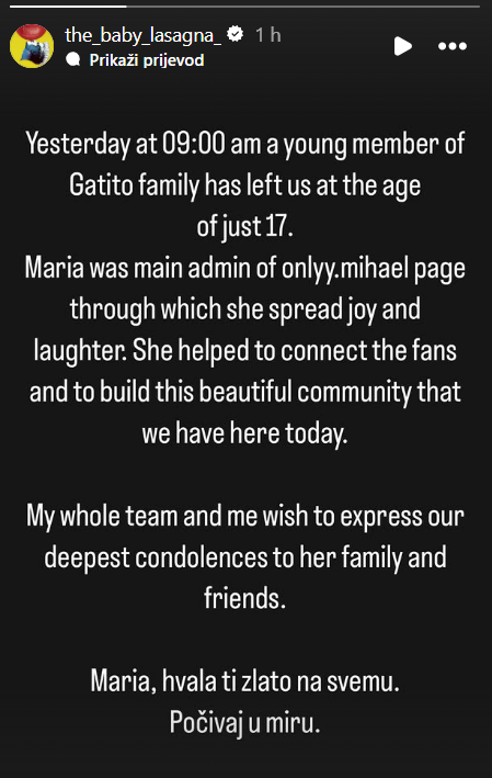 Baby Lasagna na Instagramu je objavio tužnu vijest da je preminula njegova obožavateljica. Djevojka koja je preminula zvala se Maria i imala je samo 17 godina.