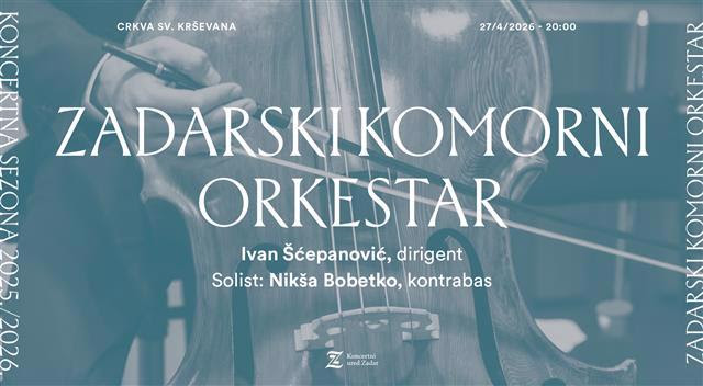 Zadarski komorni orkestar nastupa 27. travnja u crkvi sv. Krševana pod vodstvom maestra Ivana Šćepanovića, uz solista Nikšu Bobetka na kontrabasu. U središtu programa nalazi se virtuozno Bottesinijevo djelo, uz Mozartove i Dvorákove skladbe te praizvedbu novog djela mladog hrvatskog autora Šimuna Čarlija Botice.