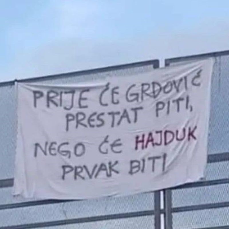 Jutro nakon poljudske utakmice na ulazu u Split osvanula je i provokativna poruka: “Prije će Grdović prestati piti, nego Hajduk prvak biti”, stoji na transparentu koji je objavio Dalmacija News.