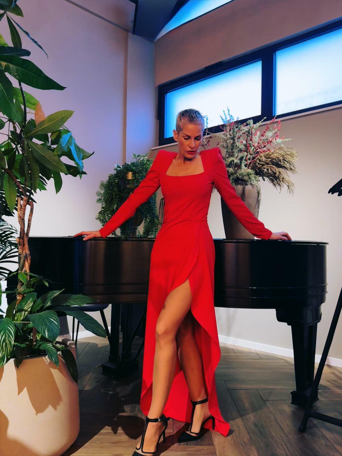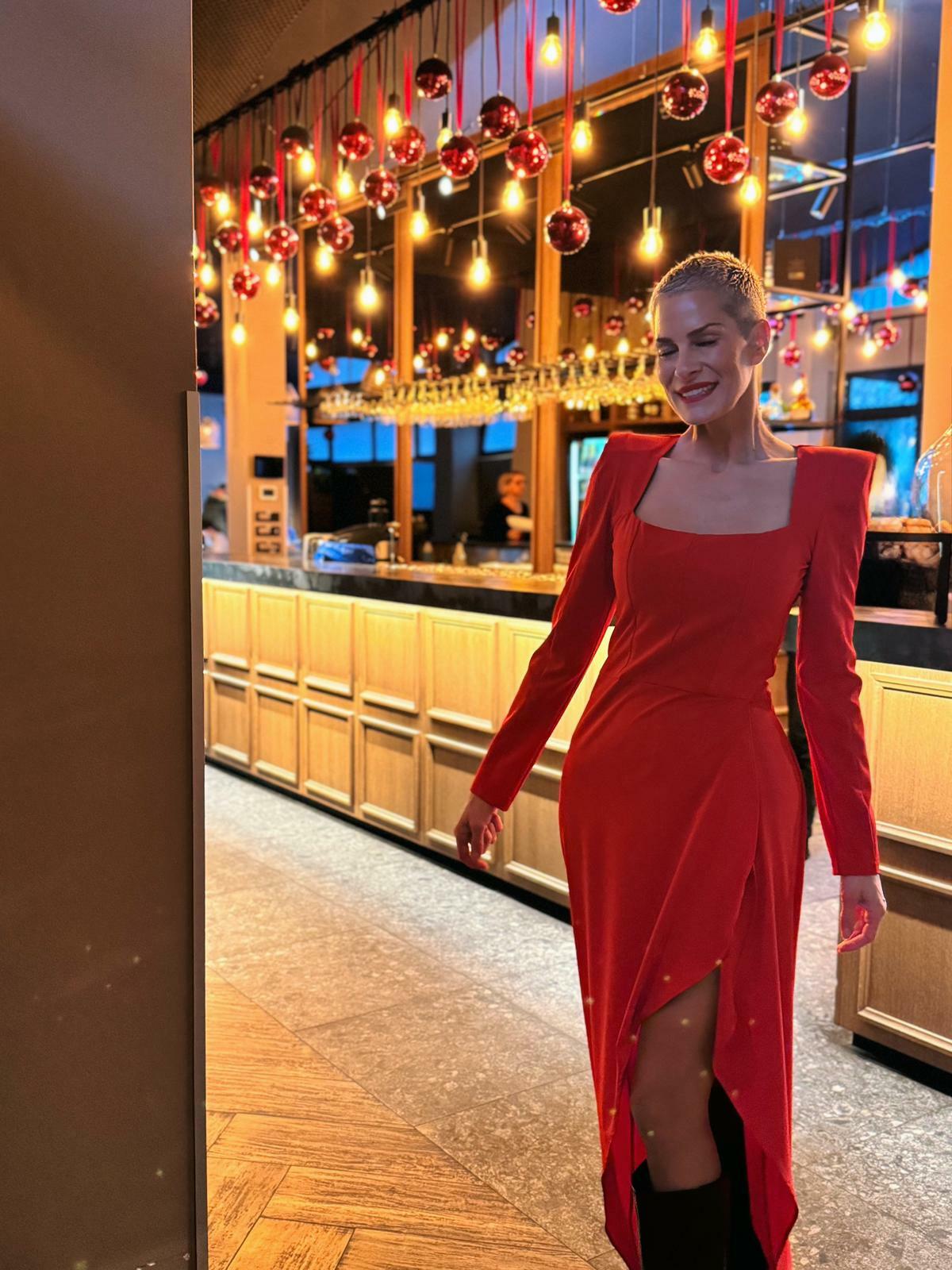 – Dugi rukavi, naravno, čine je prikladnijom za hladnije dane, dok pažljivo osmišljeni izrezi (kvadratni izrez u području ovratnika te visoki prorez na nogama) unose i dozu senzualnosti. Upravo ta ravnoteža između zatvorenog kroja, ali i izazovnih detalja, čini ovu haljinu iznimno efektnom, a dodatno se ističe i izazovna crvena boja, kazala je stilistica.