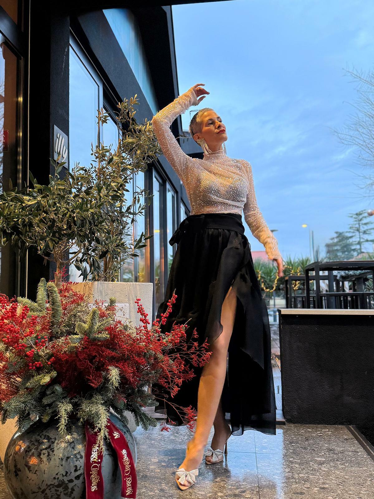 – Primjerice, ovaj model majice naizgled je vrlo jednostavan, no s obzirom na to da ima nabore na desnoj strani, u području ramena, izgleda vrlo »fashion« i drugačije od klasičnih, jednostavnih majica. Uz nju sam kombinirala dugu crnu suknju brenda MommysGarden, također poznatog zadarskoj publici, čije komade publika obožava – posebice kapute, a najviše ih nosi Lejla Filipović. Ako je suknja nekome previše upečatljiva, može se kombinirati s nekom jednostavnijom majicom. Donji dio suknje je na preklop, što omogućuje nošenje veličina od S do L, objasnila je ova zadarska stilistica te istaknula kako je ovakva kombinacija primjeren izbor za božićne domjenke, ali i za ležernija događanja, poput koncerata u Arsenalu, kao i za novogodišnju noć. Kako kaže, riječ je o kombinaciji koja zasigurno neće ostati neiskorištena u ormaru. Sana podsjeća da ovakve kombinacije, uz military čizme ili čak niže pete, mogu predstavljati i idealan odabir za svakodnevni život.
