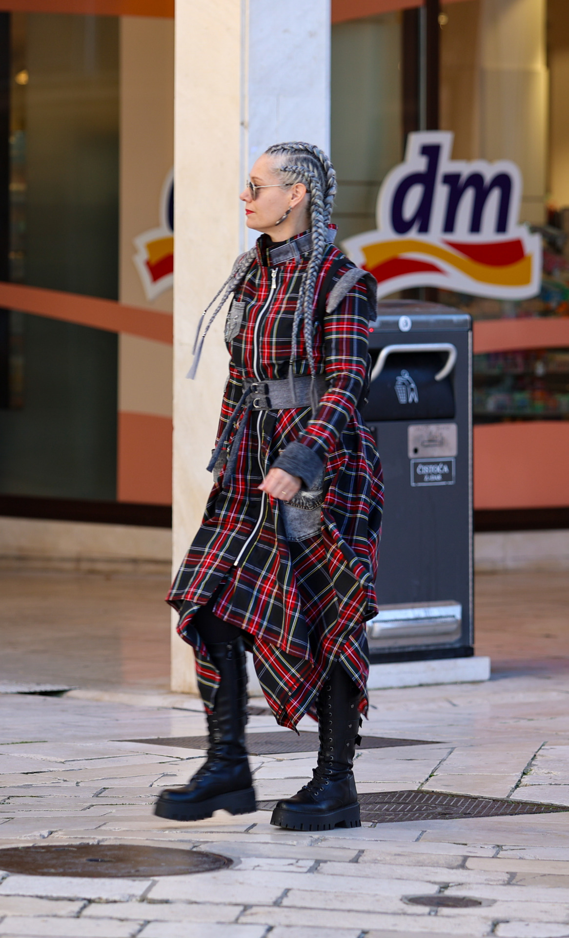 Ovaj look snažno spaja alternativni izričaj i urbanu funkcionalnost, s jasnim modnim identitetom koji ne prolazi nezapaženo. Asimetrična haljina u crveno-crnom kariranom uzorku donosi dinamiku i pomak od klasičnih silueta, dok naglašeni struk s remenom daje strukturu i definira figuru. Robusne crne čizme s debelim potplatom dodatno pojačavaju utilitarni, gotovo punk prizvuk outfita i savršeno prate ritam gradskih ulica. Pletenice u kosi i diskretne sunčane naočale zaokružuju styling osobnim, pomalo buntovnim pečatom. Kombinacija koja odiše samouvjerenošću, individualnošću i hrabrim modnim izborom.