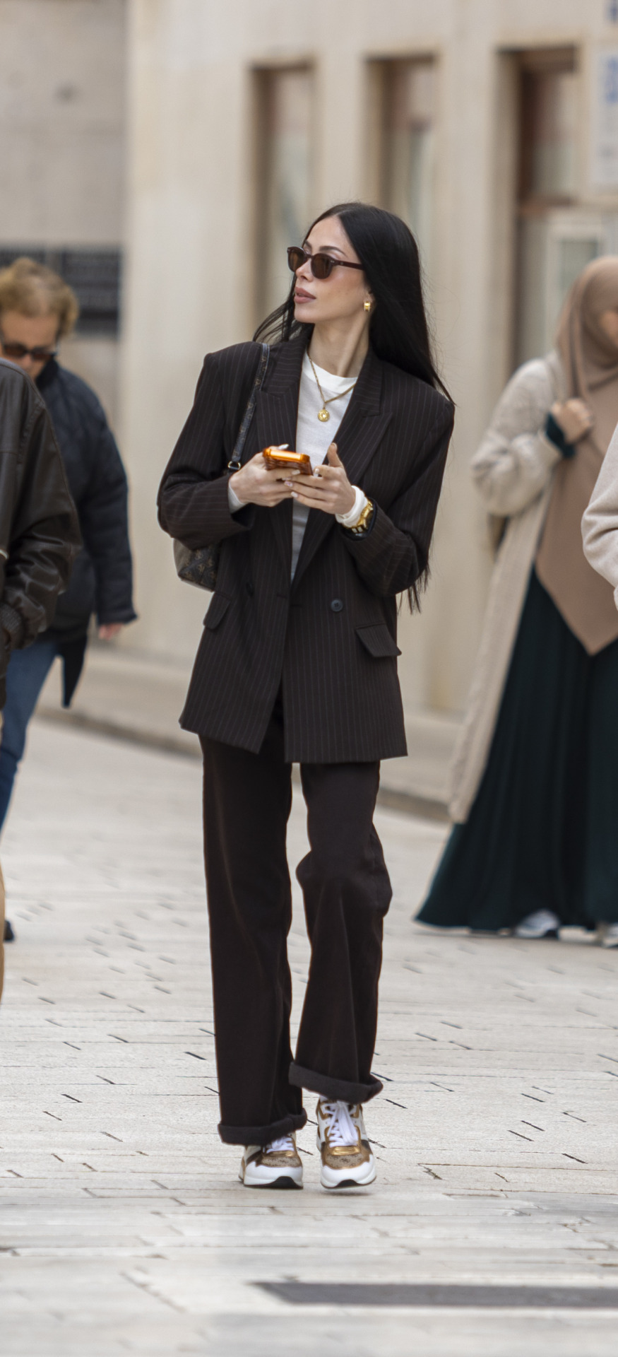 Ovaj outfit dokazuje da minimalizam može biti itekako upečatljiv. Oversized sako i hlače u sofisticiranoj nijansi – spoju sivkaste i tamno smeđe s toplim podtonom – stvaraju skladnu, monokromatsku bazu koja odiše tihim luksuzom. Jednostavna bijela majica unosi svježinu i ležernost, dok elegantna ogrlica diskretno podiže cijelu kombinaciju i daje joj profinjeni sjaj. Crne sunčane naočale i torbica preko ramena naglašavaju urbani karakter, a tenisice s uzorkom razbijaju formalnost i dodaju dozu moderne zaigranosti. Rezultat je samouvjeren, promišljen outfit koji bez imalo truda spaja poslovnu estetiku i street style energiju.