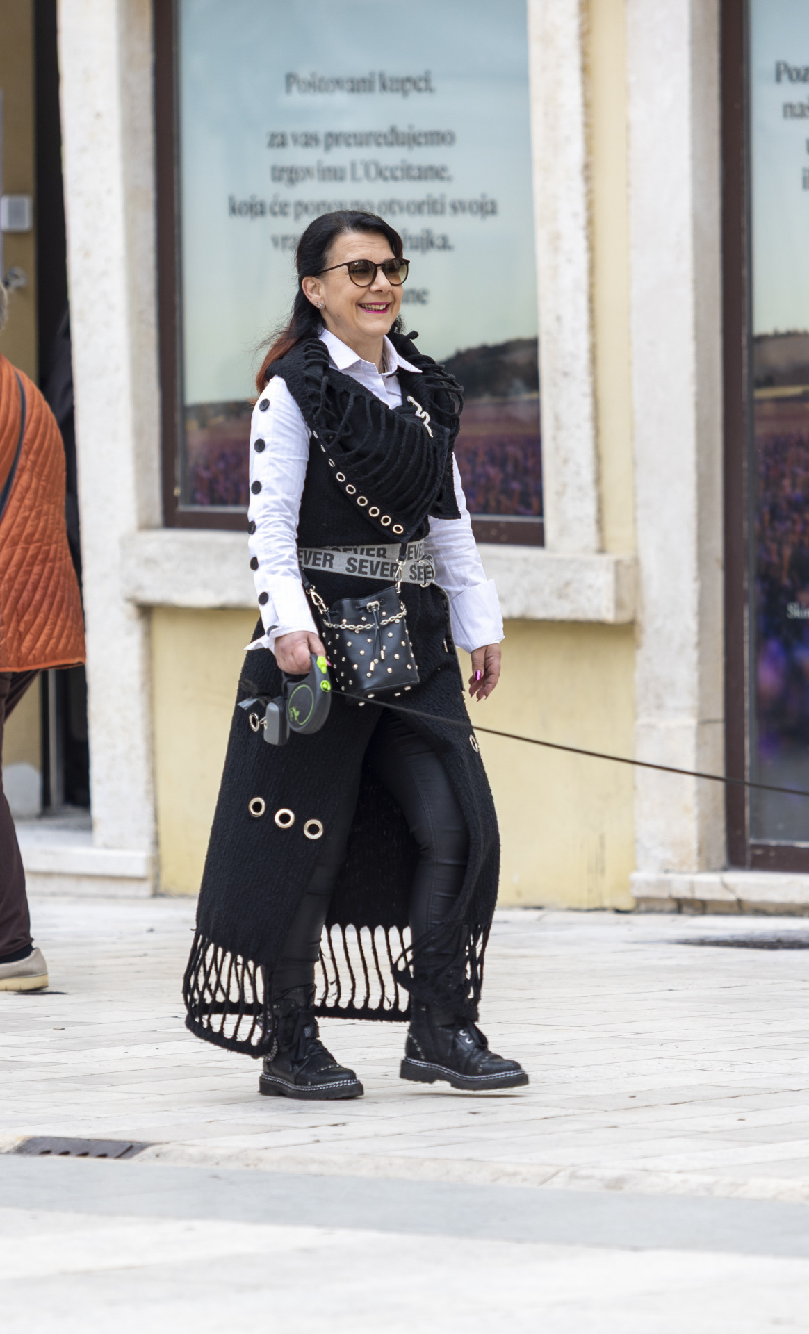 Ovaj look igra na kartu upečatljivog uzorka i samouvjerenog stava. Veliki kaput s dominantnom bijelom podlogom i crnim, nepravilnim šarama djeluje poput nosivog umjetničkog platna – efektan, moderan i drugačiji. Ispod njega proviruje marama u tamnijem, smeđem tonu s decentnim uzorkom koja unosi toplinu i dodatnu dimenziju stylingu. Crne uske hlače i čizme stvaraju čistu, elegantnu bazu koja dopušta kaputu da bude u prvom planu, dok torbica preko tijela zaokružuje kombinaciju praktičnom urbanom notom. Sunčane naočale podignute na glavu daju nonšalantan završetak – dojam žene koja bez puno truda nosi odvažan komad i pretvara ga u svoj zaštitni znak.