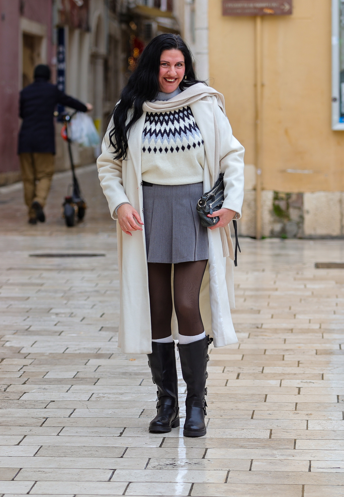 Ova kombinacija odiše nenametljivom elegancijom i udobnošću. Svijetli kaput i pleteni pulover s popularnim nordijskim uzorkom daju toplinu i casual šarm, dok suknja i visoke čizme održavaju outfit ženstvenim i urednim. Sve zajedno djeluje prirodno, nosivo i idealno za dnevni boravak u gradu.