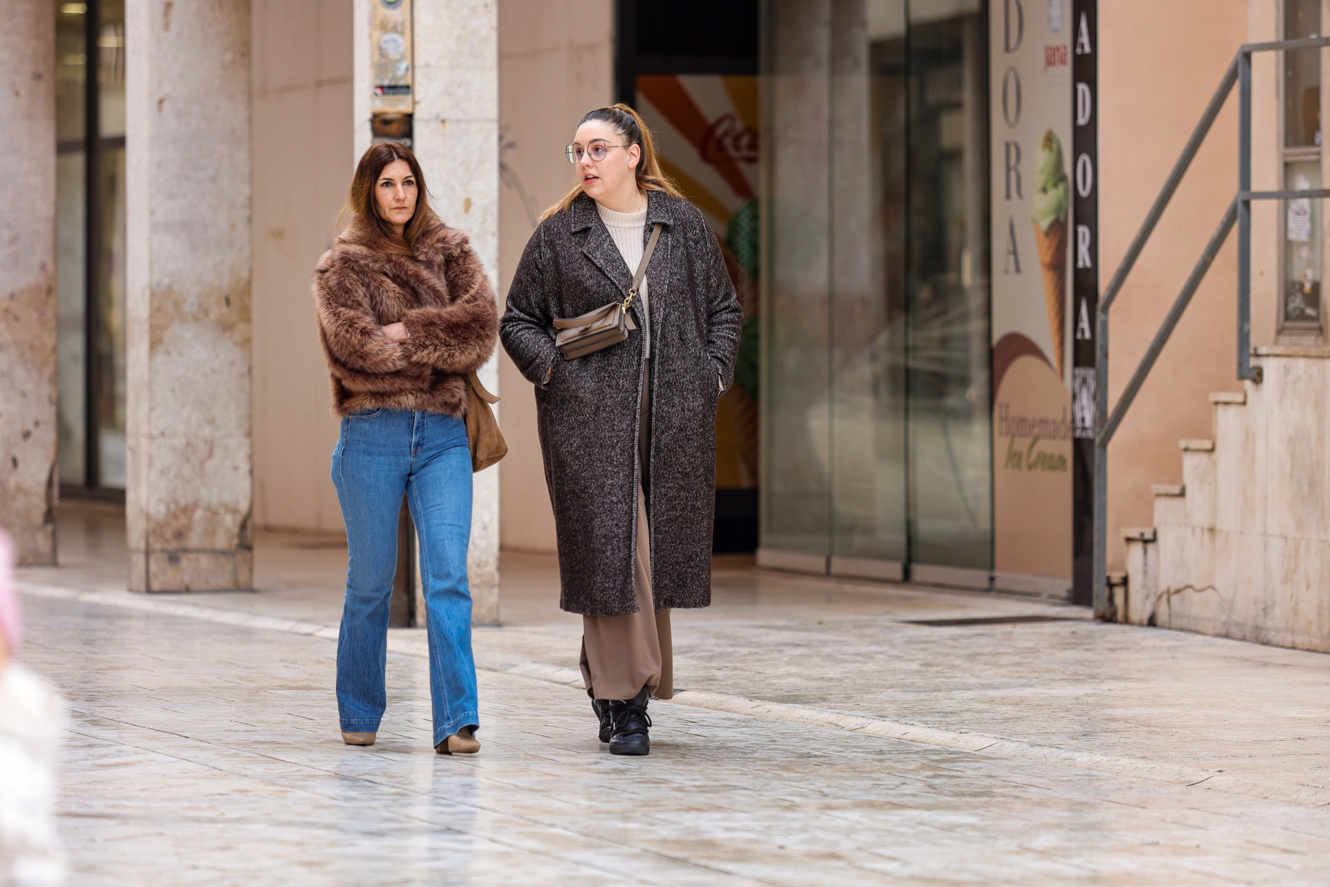 Dvije dame odlučile su se na bezvremensku smeđu boju dokazujući da su smeđi komadi jedan najzahvalniji od izbora u zimskom ormaru. Dok se jedna odlučila za kratku krznenu bundu koja odiše luksuzom i klasičnim šarmom, njena je prijateljica odabrala dugi kaput u tamnijem tonu ispod kojeg se naziru smeđe hlače. Različite teksture dodatno obogaćuju obje kombinacije i pokazuju kako se smeđa boja lako prilagođava i mekšim i strožim siluetama. Cjelokupan dojam je skladan i sofisticiran, a oba outfita odišu bezvremenskim stilom koji ne podliježe prolaznim trendovima.