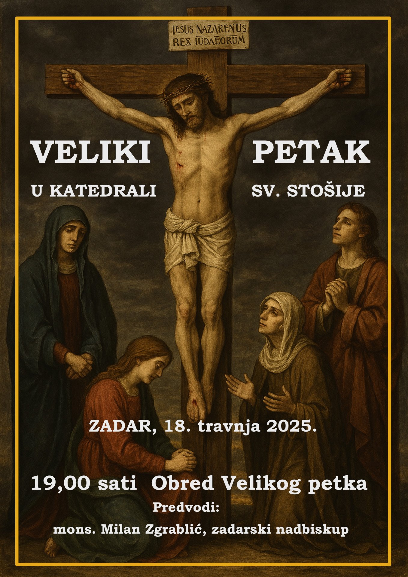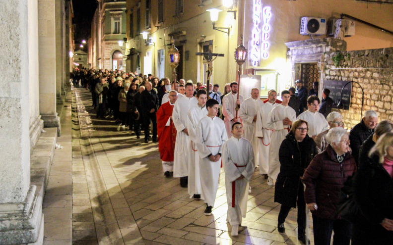 Na Veliki petak, 18. travnja, Službu Muke Gospodnje u katedrali sv. Stošije u Zadru u 19 sati predvodi zadarski nadbiskup Milan Zgrablić. Nakon obreda u katedrali, mons. Zgrablić će središtem grada u procesiji nositi križ.