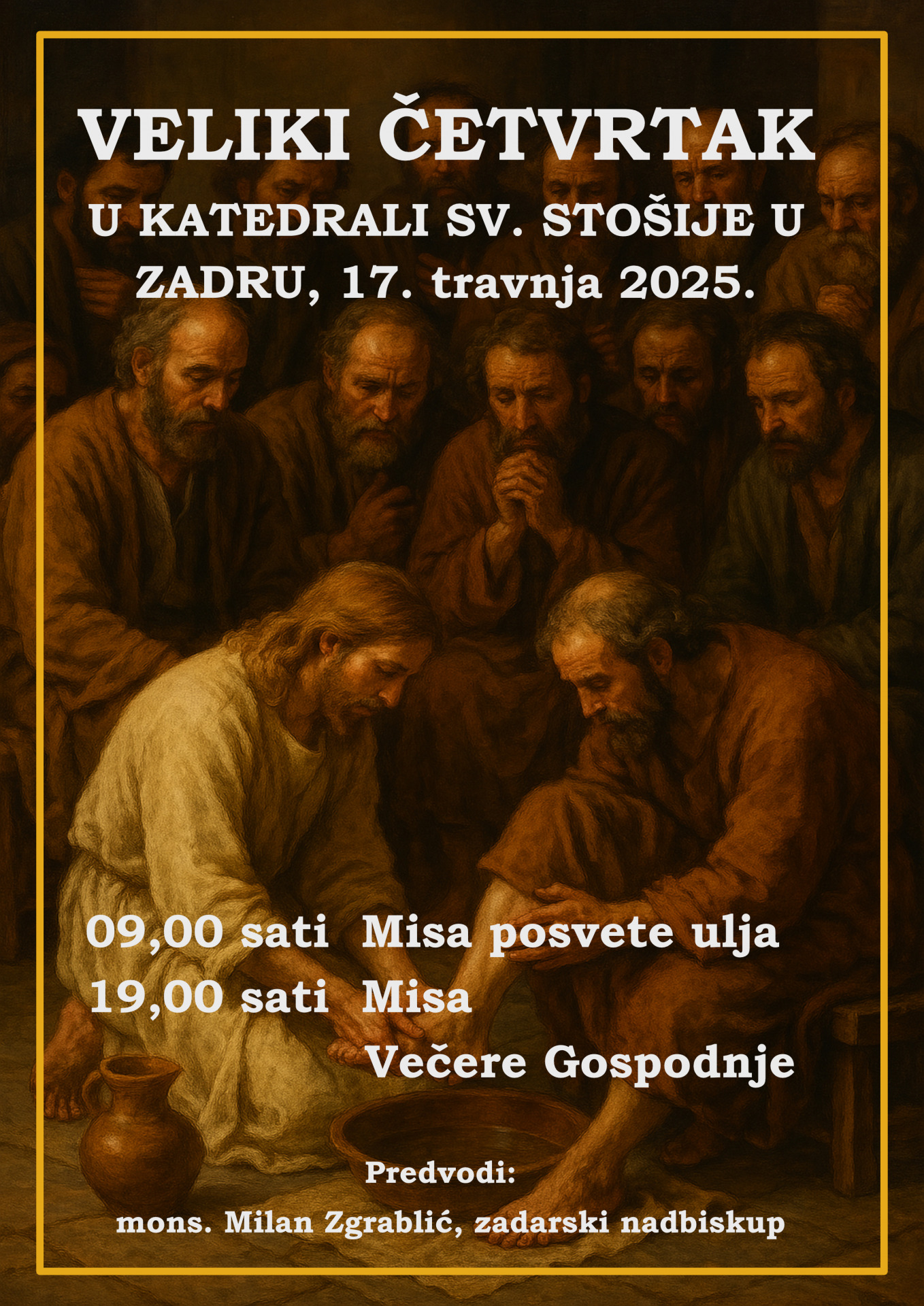 Na Veliki četvrtak, 17. travnja, Misu posvete ulja u 9 sati u katedrali sv. Stošije u Zadru predvodi zadarski nadbiskup Milan Zgrablić. Na toj misi će svećenici djelatni u Zadarskoj nadbiskupiji obnoviti svoja svećenička obećanja dana na ređenju.