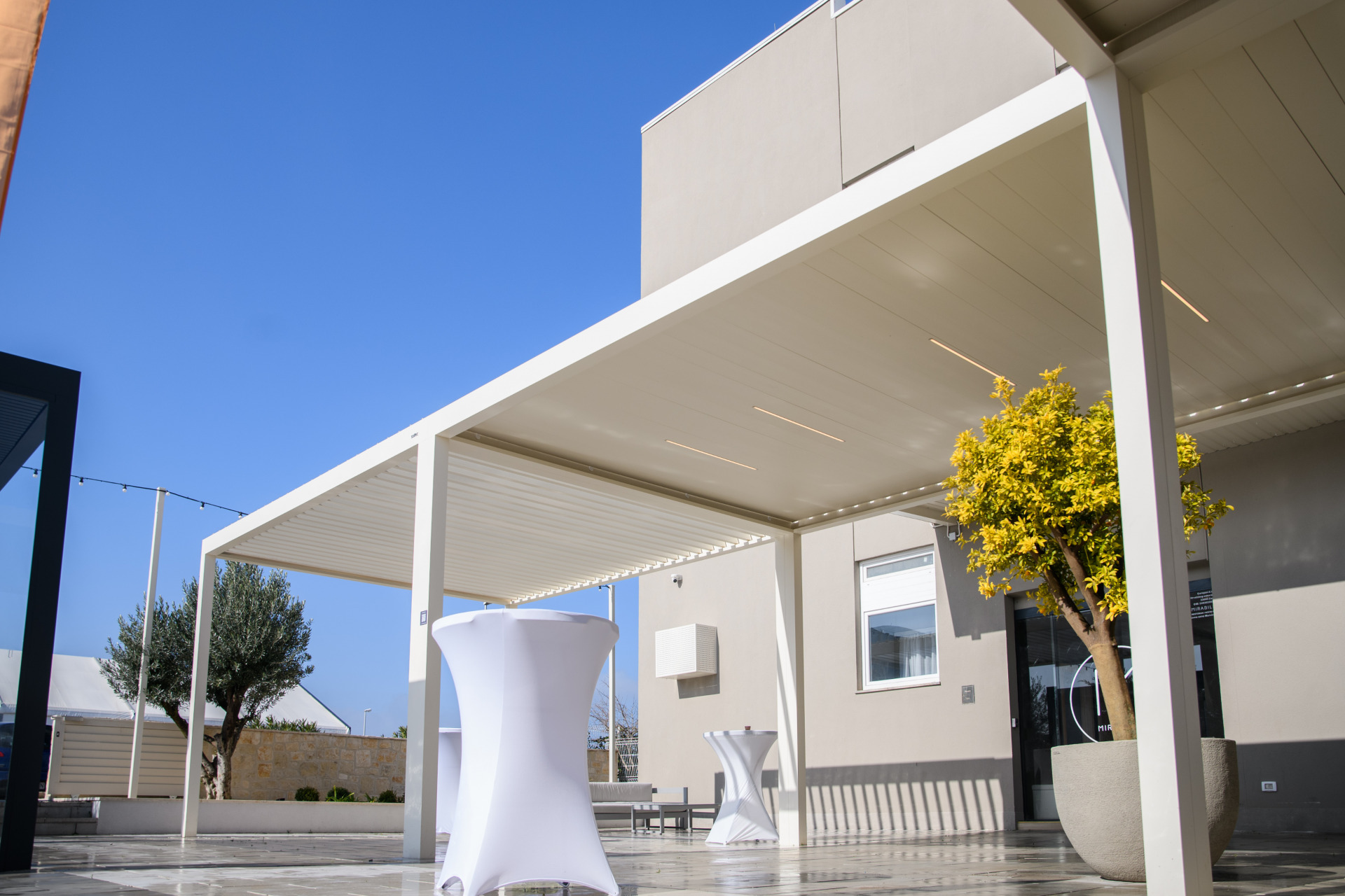 »Myrabilis« se upravo zato odlučio za jedno od njihovih najkvalitetniji rješenja – bioklimatsku pergolu, koja je dizajnirana za zaštitu od vremenskih nepogoda u svim godišnjim dobima. To je postignuto patentiranim rotirajućim lamelama od nehrđajućeg čelika i aluminija.
