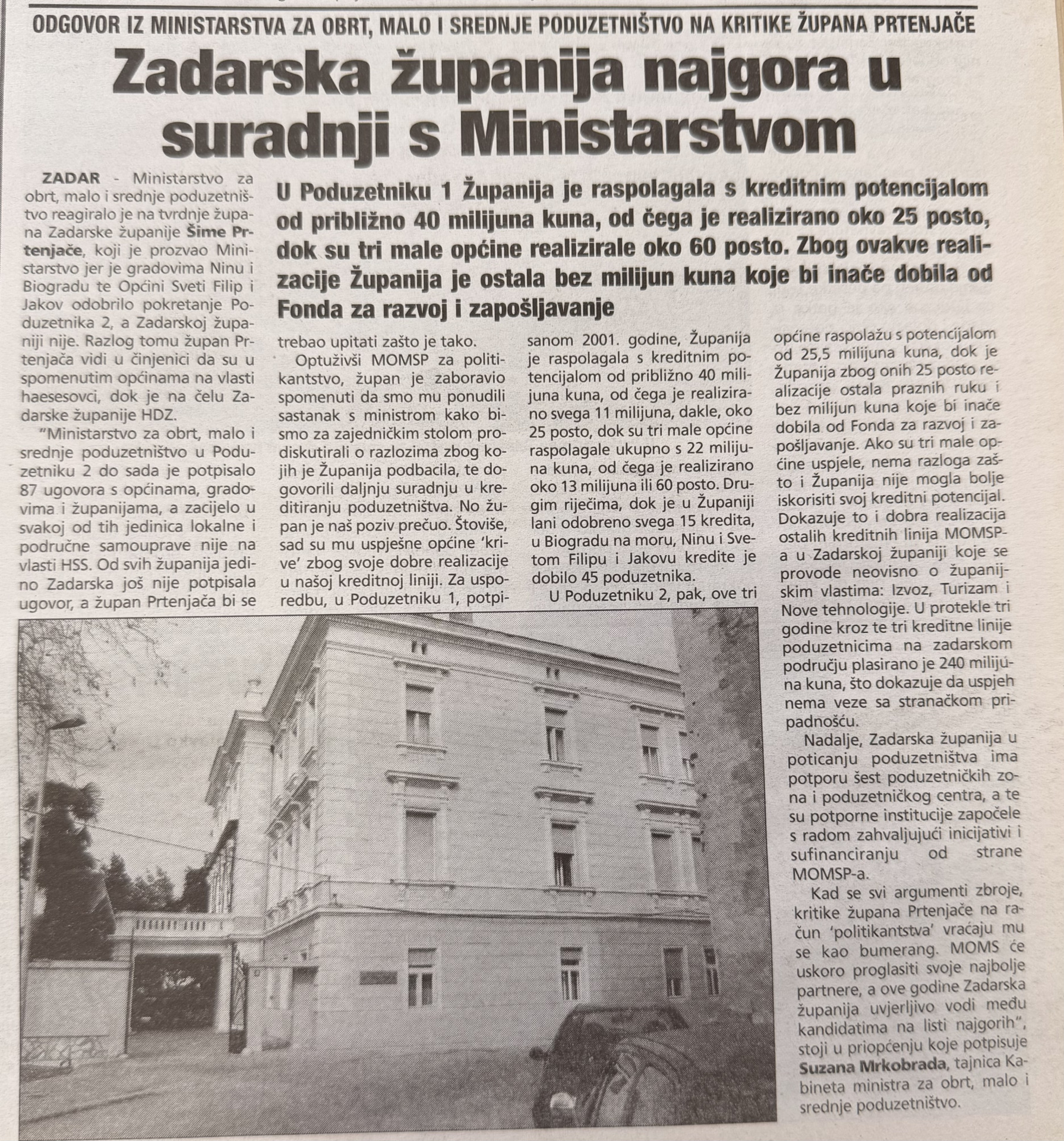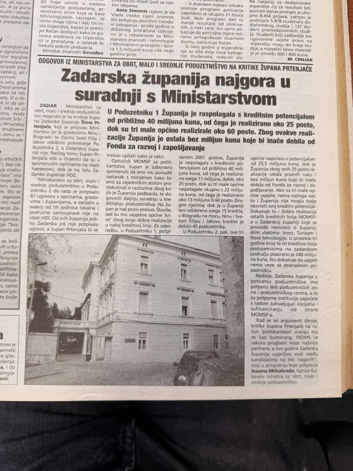 Istoga dana novine su donijele i političko-gospodarsku temu: oštar odgovor Ministarstva za obrt, malo i srednje poduzetništvo na kritike Zadarske županije. U tekstu se navodi kako je Zadarska županija ocijenjena kao najlošija u suradnji s Ministarstvom, posebice u provedbi programa kreditiranja poduzetništva.
