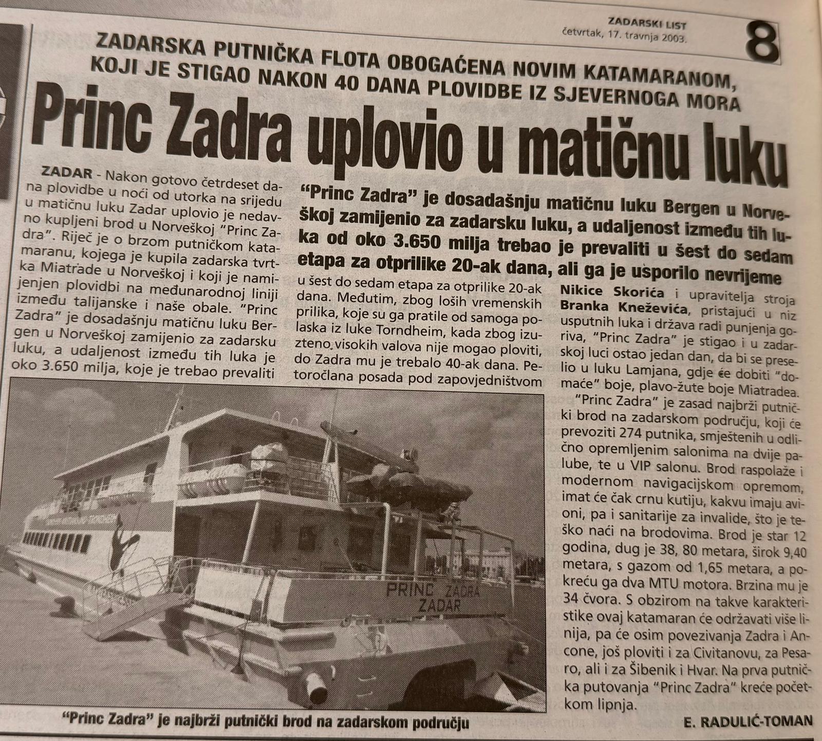 U središtu prve vijesti bio je dolazak novog katamarana “Princ Zadra”, koji je nakon dugog i zahtjevnog putovanja iz Norveške uplovio u zadarsku luku. Riječ je o brzom putničkom brodu koji je zadarska tvrtka Miatours kupila u Norveškoj, gdje je prethodno plovio pod imenom u luci Bergen. Planirano putovanje od oko 3.650 milja trebalo je trajati između 20 i 25 dana, no loši vremenski uvjeti, visoki valovi i nevrijeme produžili su plovidbu na gotovo 40 dana.