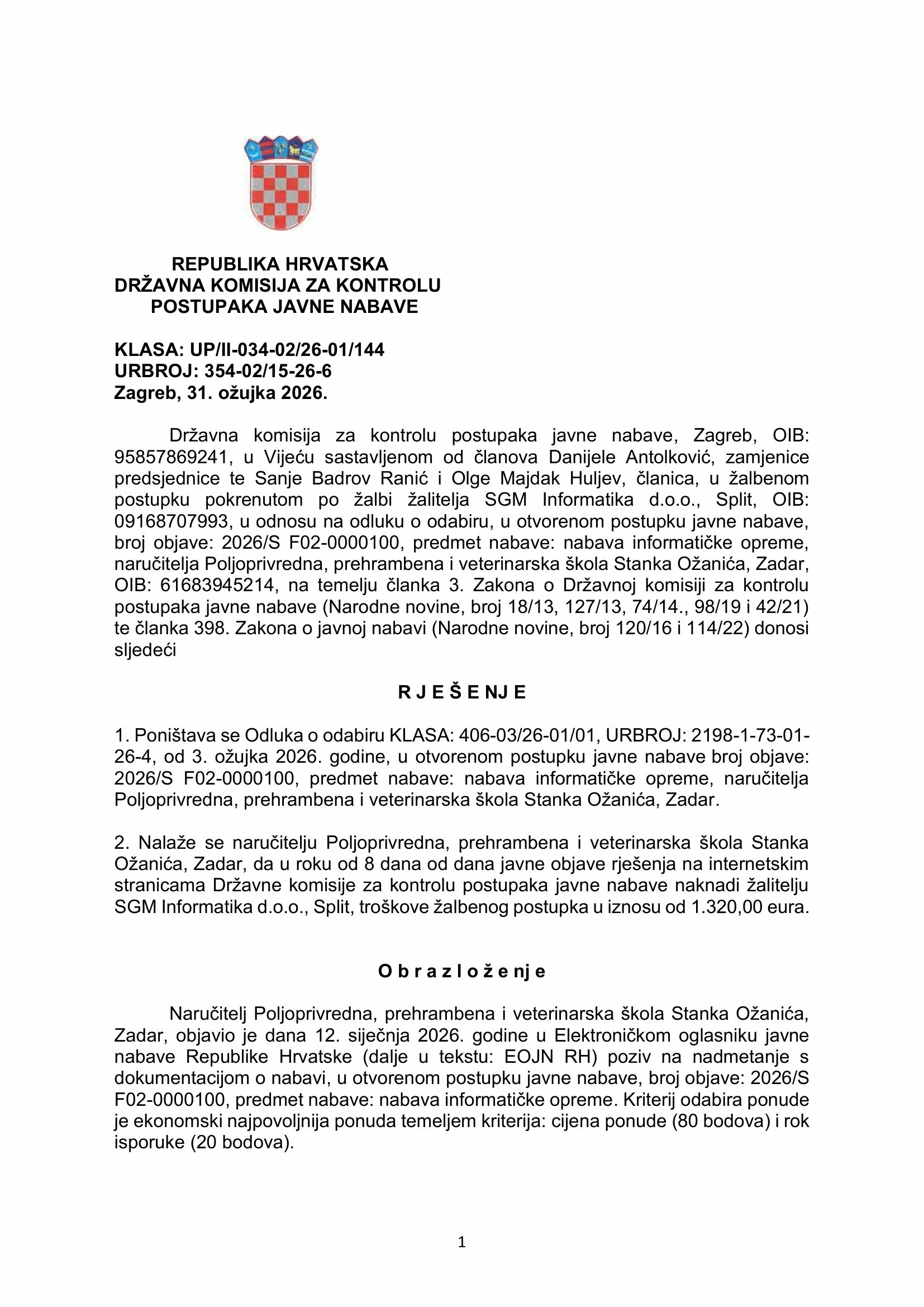 Stručno povjerenstvo Poljoprivredne, prehrambene i veterinarske škole Stanka Ožanića iz Zadra zabrljalo je pri provedbi javnog natječaja za nabavu informatičke opreme vrijednog 50-ak tisuća eura. Drugostupanjsko tijelo, Državna komisija za kontrolu postupaka javne nabave (DKOM) poništila je odluku o odabiru na natječaju ove škole, koja treba ponovno ocijeniti pristigle ponude.