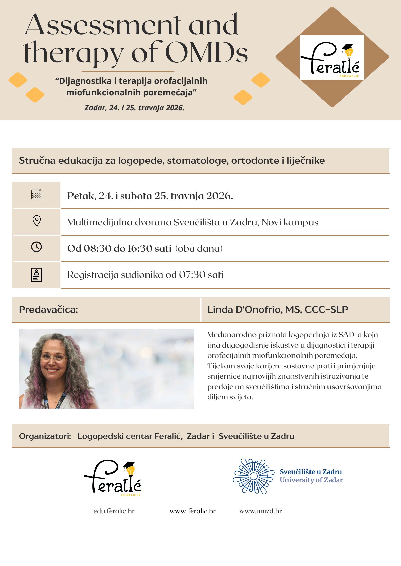 Zadar će 24. i 25. travnja 2026. godine biti središte stručnog okupljanja logopeda, otorinolaringologa, stomatologa i ortodonata na edukaciji “Dijagnostika i terapija orofacijalnih miofunkcionalnih poremećaja” u organizaciji Logopedskog centra Feralić i Sveučilišta u Zadru.