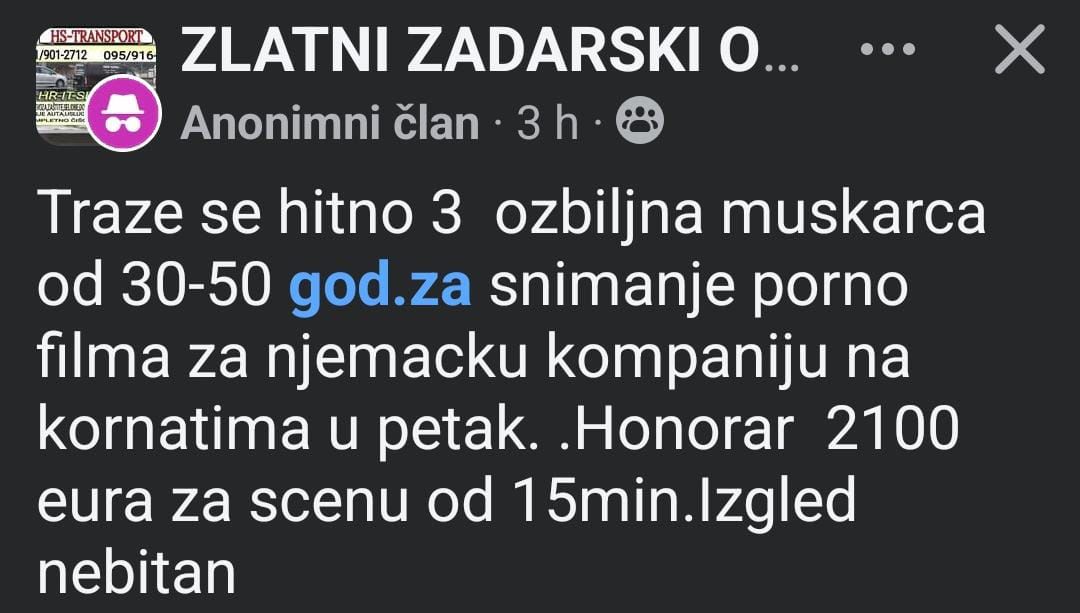 – Traže se hitno tri ozbiljna muškarca u dobi od 30 do 50 godina za snimanje porno filma za njemačku kompaniju na Kornatima u petak. Honorar 2100 eura za scenu od 15 minuta. Izgled nebitan, stoji u objavi.