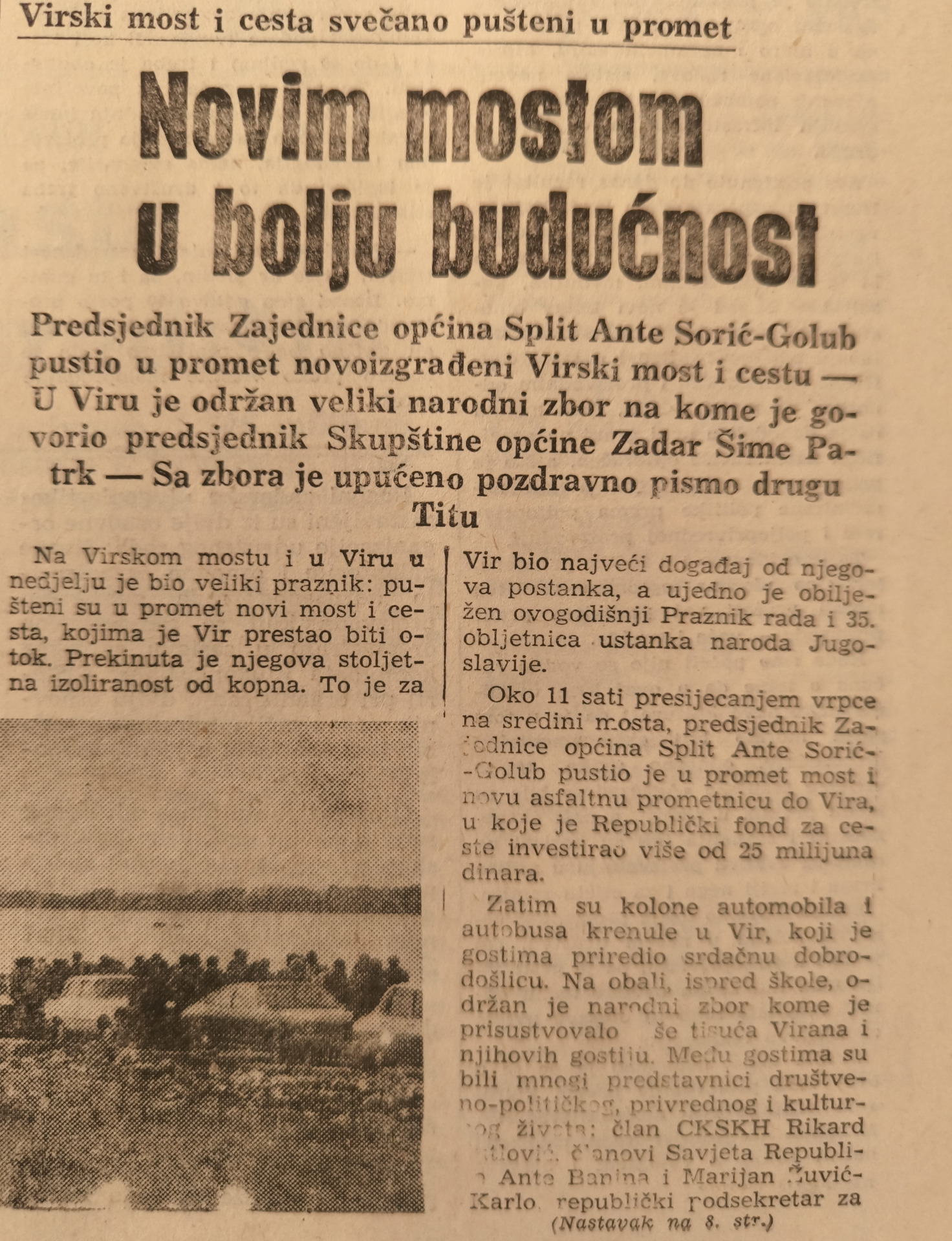 Tog 25. travnja 1976. s pravom je slavio cijeli Vir, a Virani su javno bili pohvaljeni jer su se gotovo svi odrekli prava na naknadu za zemljište preko kojeg je prošla cesta. Pohvaljeni su još za asfaltiranje i uređenje mjesta za što su tijekom 1975. izdvojili 1.000.000 dinara, odnosno približno 55.000 američkih dolara, ili oko 340.000 dolara koliko bi taj iznos kupovne moći vrijedio danas. Tog je prijepodneva, popodneva, večeri i noći u Viru bilo nekoliko tisuća ljudi, pa su se domaći i gostujući govornici svečano izmjenjivali na virskoj rivi, sve dok Patrk nije naglasio kako Vir praktički postaje predgrađe Zadra. Predsjednik Skupštine općine Zadar ukazao je na privredni značaj i potencijal novoizgrađenog mosta te javno istaknuo kontroverznu ideju oko ovog kolosalnog projekta – izgradnju druge nuklearne elektrane u Jugoslaviji. Kamen temeljac za prvu nuklearku položen je dvije godine ranije u Krškom na projektu na kojemu su radili američki Westinghouse Electric Corporation, Gilbert Associates Inc., Gradis, Hidroelektra, Hidromontaža i Đuro Đaković.