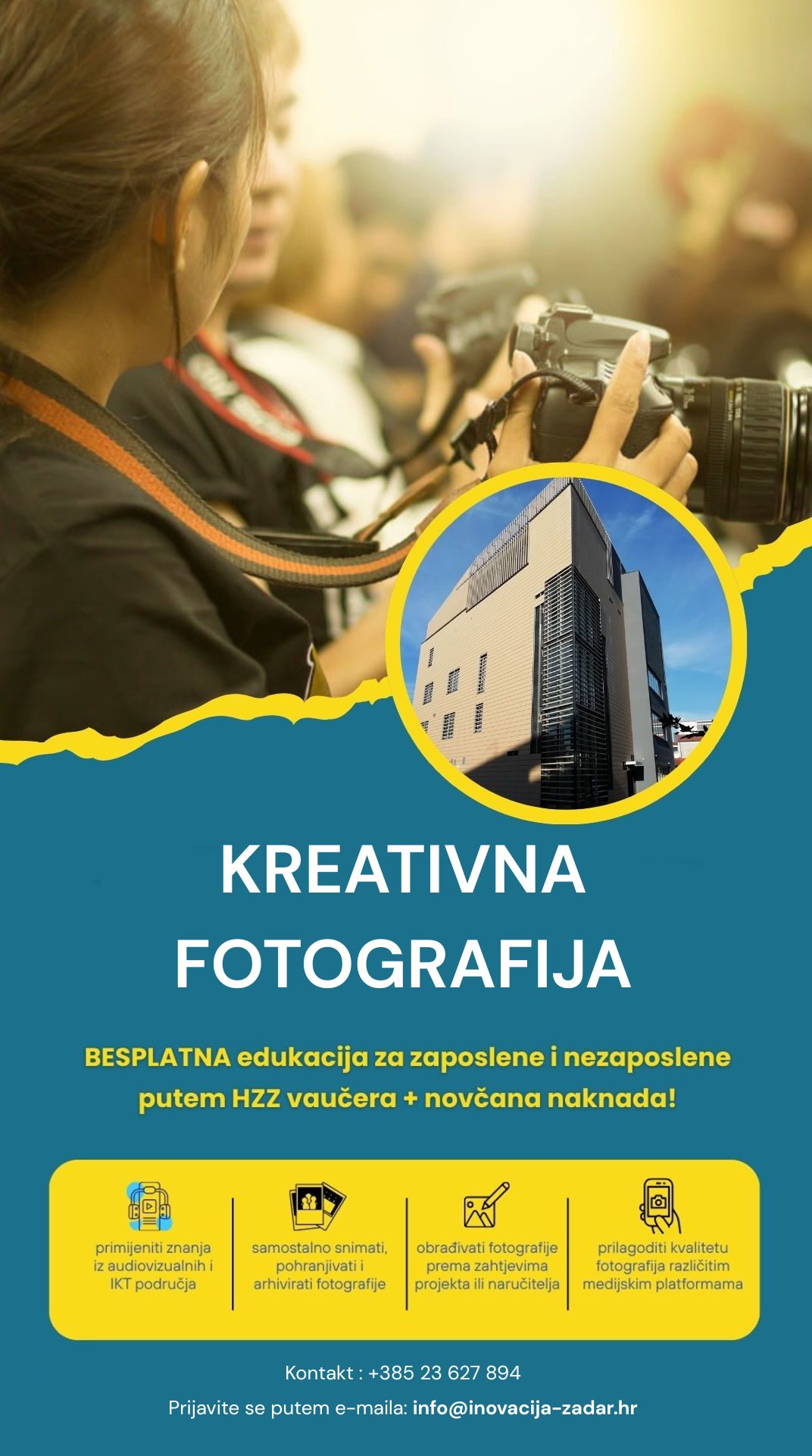 Ustanova za razvoj kompetencija, inovacija i specijalizacije Zadarske županije INOVAcija poziva sve zainteresirane zaposlene i nezaposlene osobe na sudjelovanje u Programu neformalnog obrazovanja – Kreativna fotografija, besplatnoj edukaciji usmjerenoj na razvoj praktičnih znanja i vještina potrebnih u suvremenim kreativnim i digitalnim industrijama.