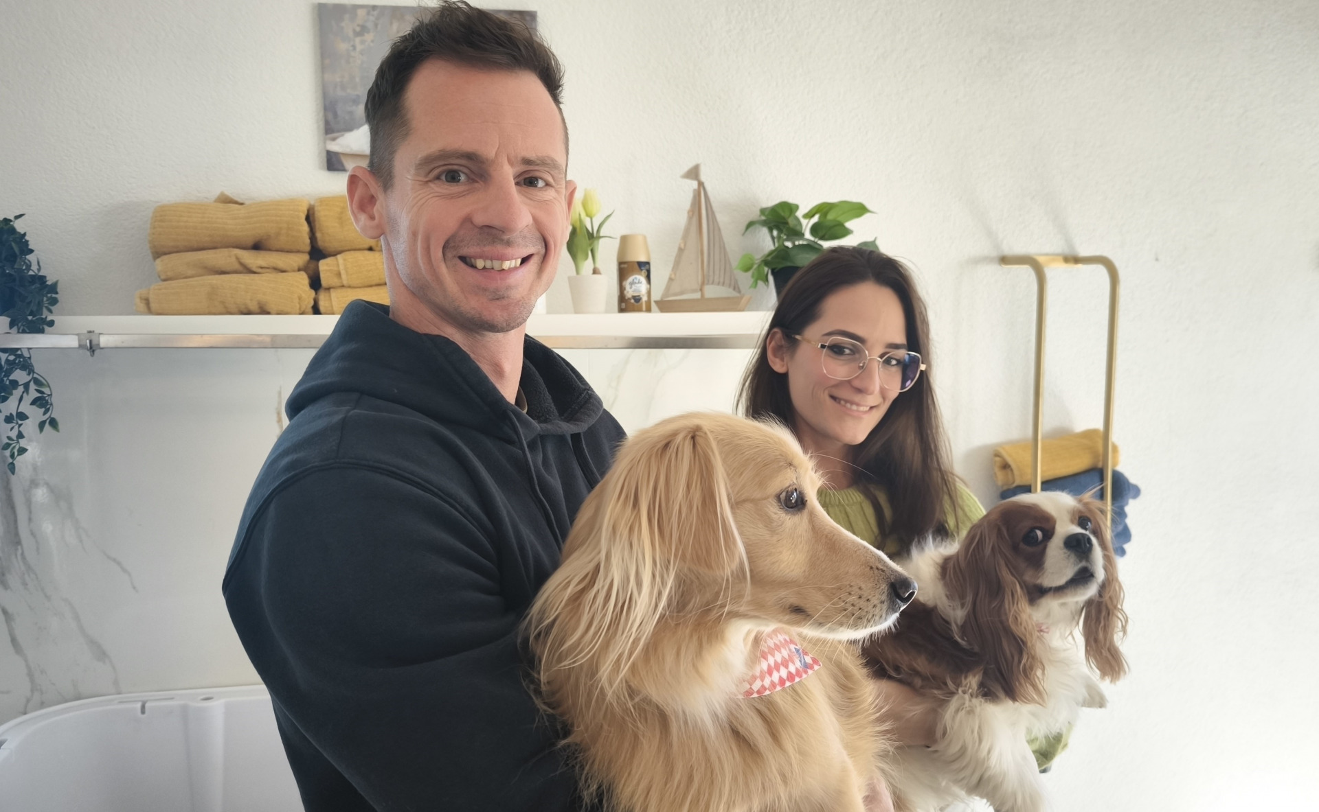 – Kao groomer za pse radim već 15 godina, a školovanje sam završila u Budimpešti. Sama ideja pseće kozmetike rodila se iz ljubavi prema životinjama. Od malih nogu obožavam sve životinje, a oduvijek sam imala kućne ljubimce – mačke i pse. Trenutačno imam četiri mačke i dva psa – govori nam Gyöngyi, elegantna 33-godišnja supruga sedam godina starijeg Máté Zakara. No, na ulazu u salon koji sadržajem, šarmom, opremom i ponudom usluge također daleko nadvisuje sve što postoji u Zadru i okolici, dočekali su nas Zafir i Sisy. Zafir je mazni i zaigrani desetogodišnji mali zlatni retriver, dok je pomalo nepovjerljiva šestogodišnja Sisy klasični Kavalirski španijel kralja Charlesa.