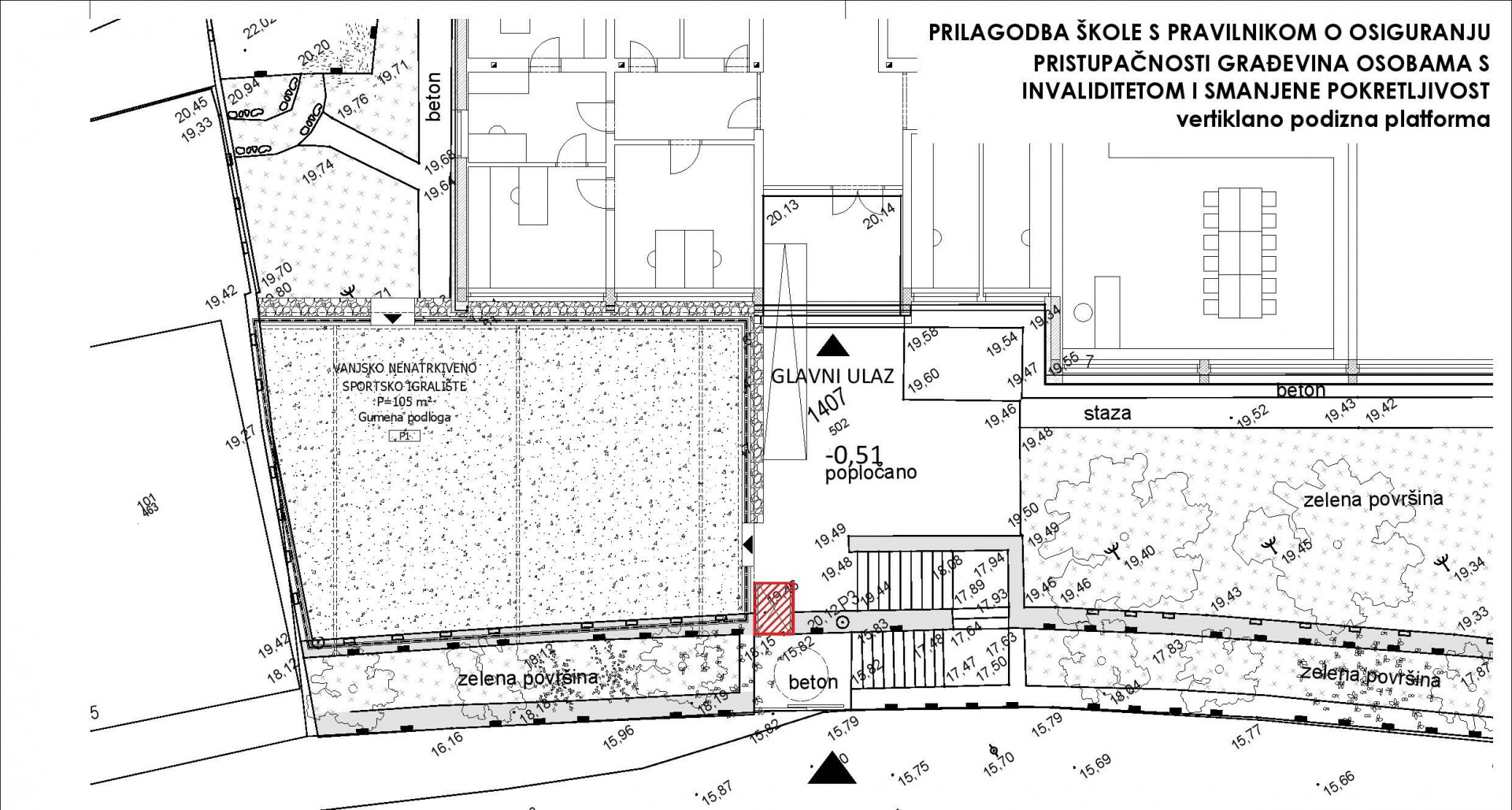 Nadogradnja uključuje i novoprojektirane stube na jugozapadnom pročelju postojeće škole, koje povezuju dvoranu s postojećom školom, kao i izvedbu dizala na sjevernom pročelju škole i izvedbu podizne platforme u školskom okolišu kako bi se, sukladno zakonskoj regulativi, omogućio pristup osobama smanjene pokretljivosti.
