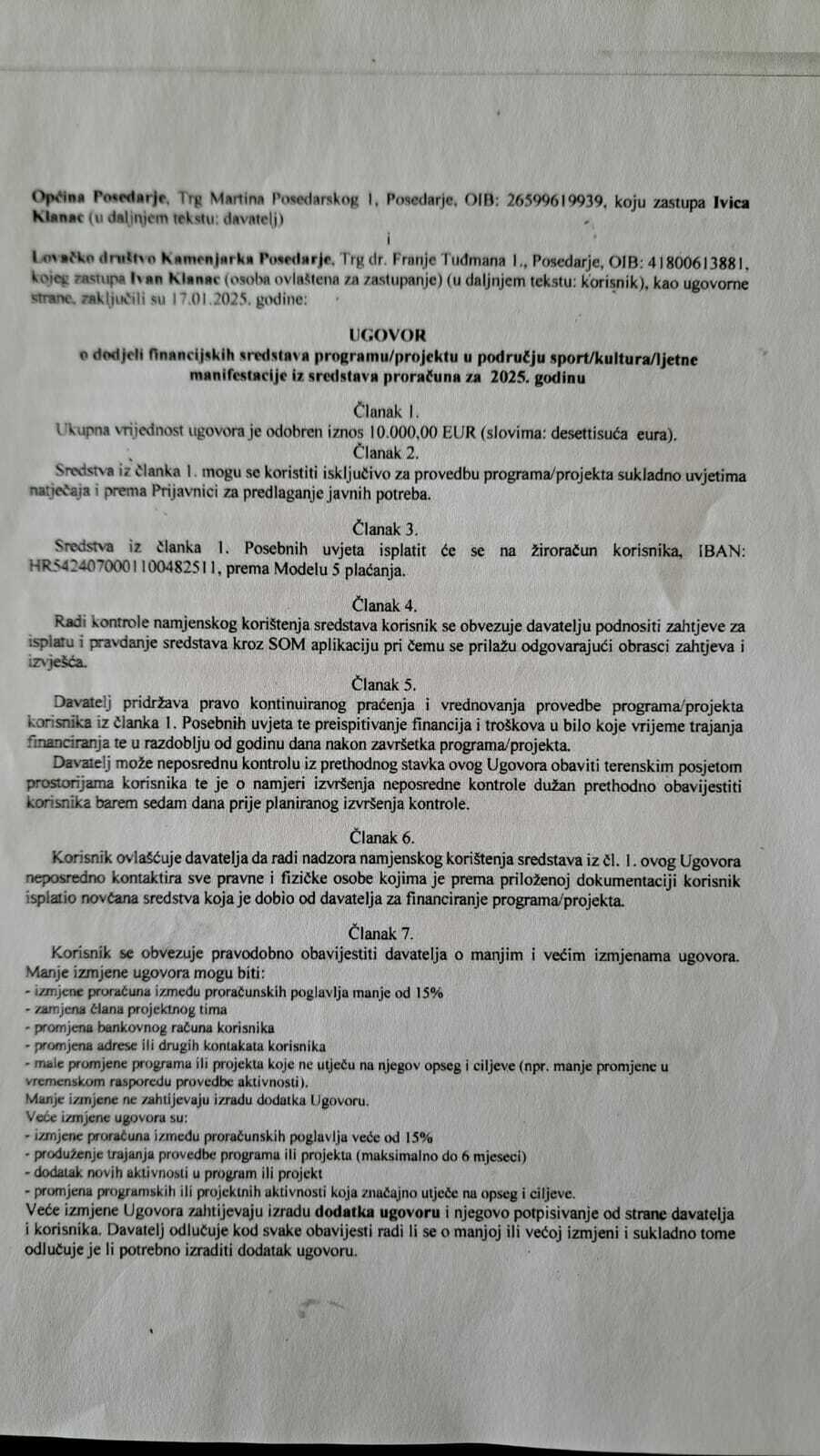 – Naše lovačko društvo se javilo na javni poziv Općine za 2025. godinu tražeći da nam se odobri novac, 20 tisuća eura, a budući da je odlučivanje o iznosima u nadležnosti načelnika Općine, Ivice Klanca, on je odlučio kako će nam isplatiti 10 tisuća eura. Negdje u veljači ili ožujku 2025. sam došao u Ured načelnika gdje sam s njim uime LD-a Kamenjarka potpisao taj ugovor, kaže nam Ivan Klanac, predsjednik Kamenjarke i predsjednik Općinskog vijeća.