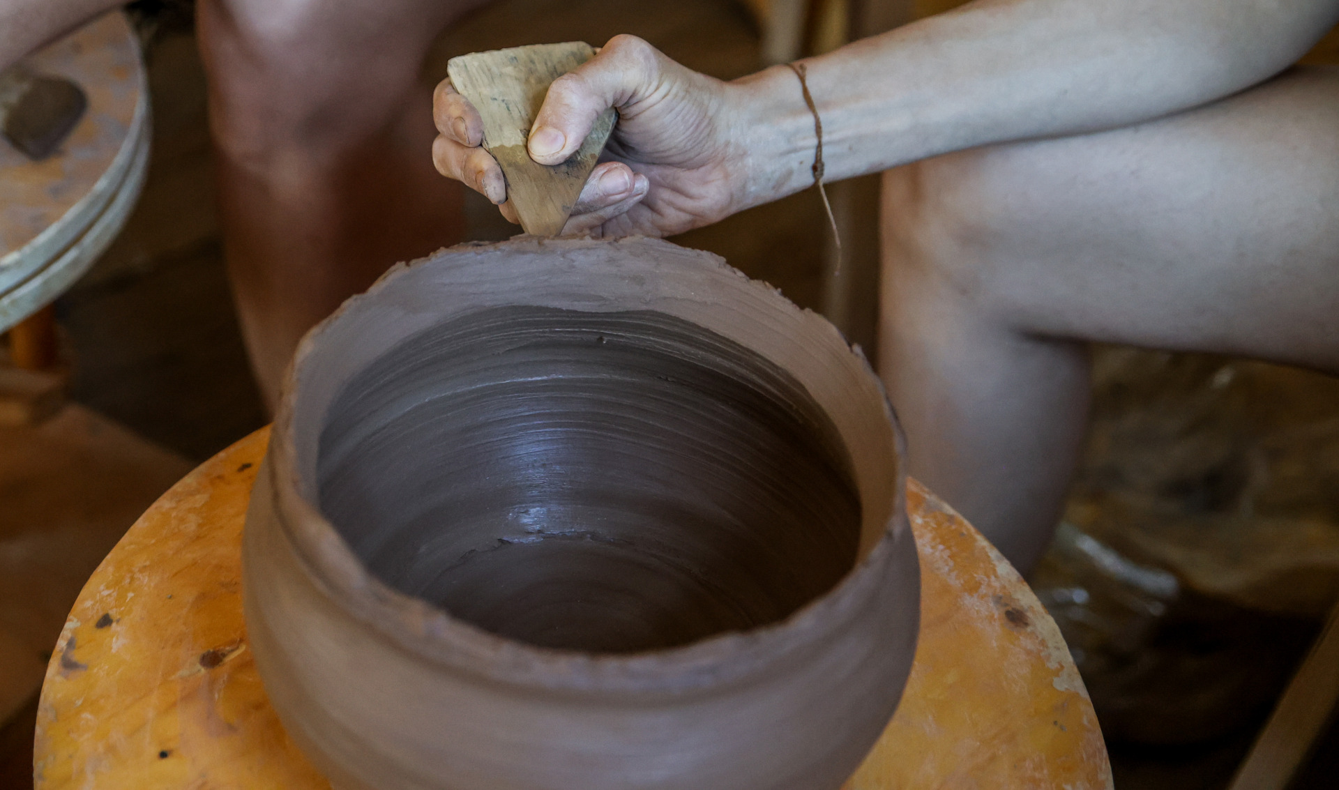 Dok razgovaramo o brudetu i janjetini kuhanoj u lopižu, usput gradimo lagani »zidić« od gline kojeg kasnije nadograđujemo i lagano spajamo valjuške, prstima zaglađujemo glinu i oblikujemo posudu. Razganjačom se pomažemo, malo ju širimo, povezujemo prstima….